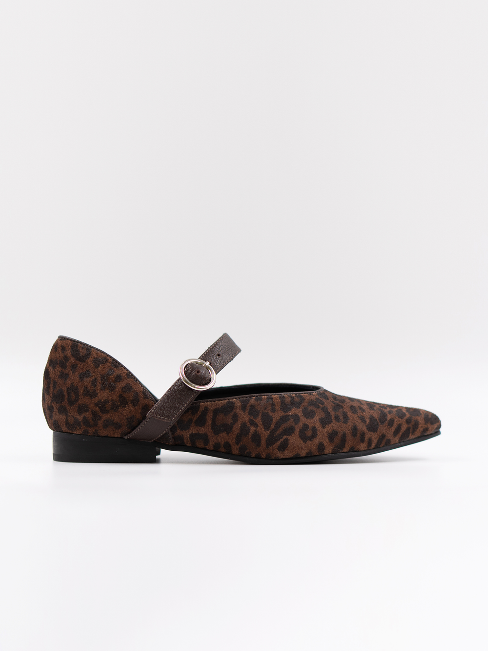 Ballerina en cuero reno con print cheeta, Con un detalle cruzado en cuero chocolate liso. Hebilla plateada.