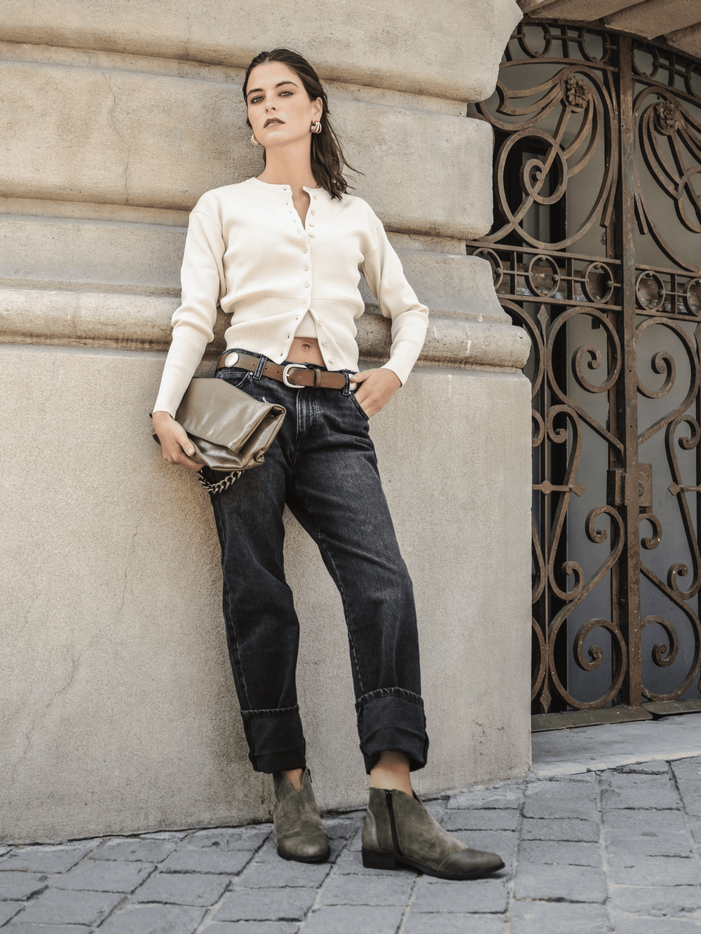 Botín en combinación de cuero reno y cuero liso verde, con un leve escote frontal y punta estilizada que realzan su diseño. Versátil y cómodo, perfecto para dar un aire moderno a tus looks diarios.