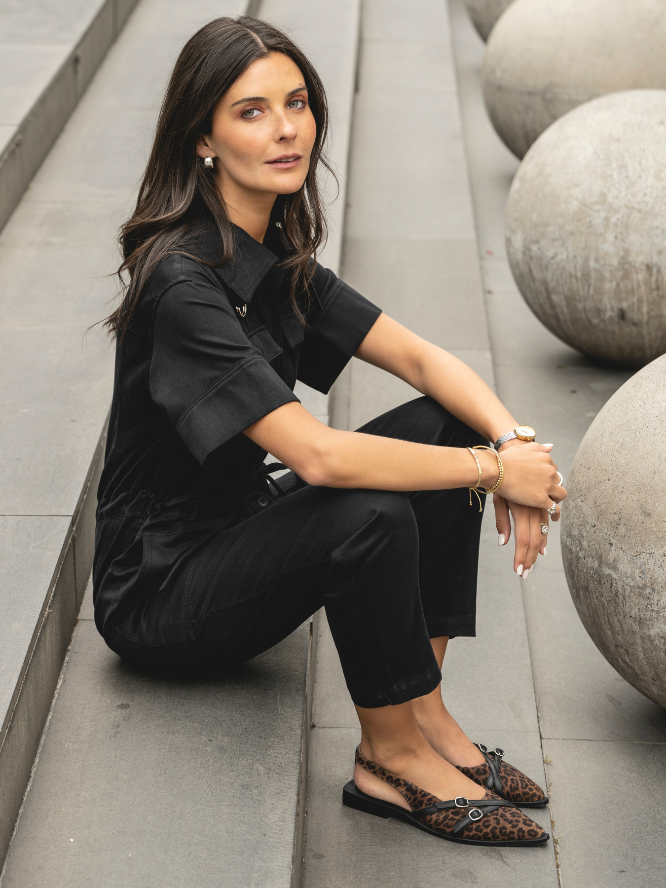 Babucha en cuero reno con print cheeta. Tira trasera y detalles en cuero liso negro con hebilla metálica en la punta. Su silueta de punta y talón cuadrados aportan un aire contemporáneo y elegante. Perfectos para tus tardes de verano.