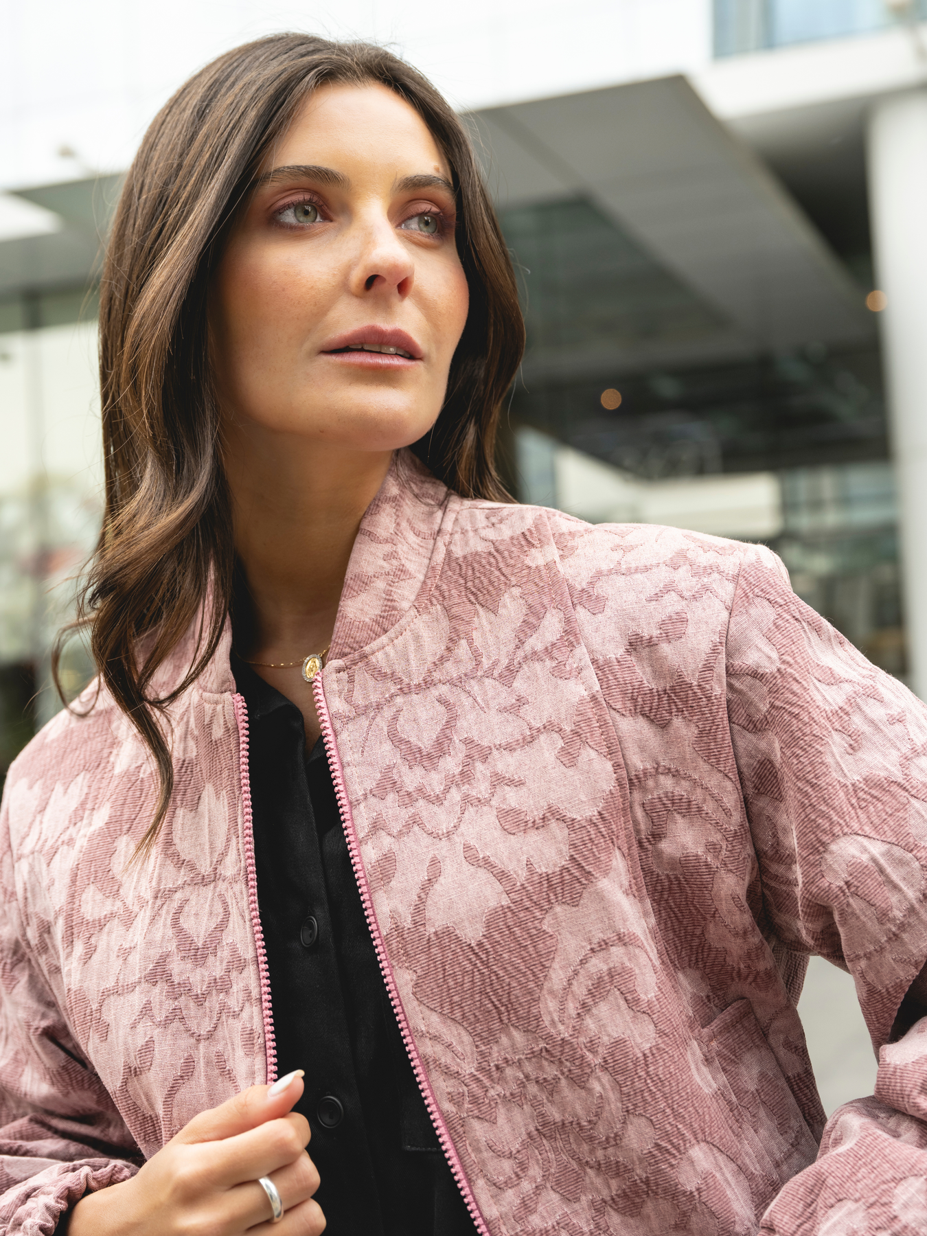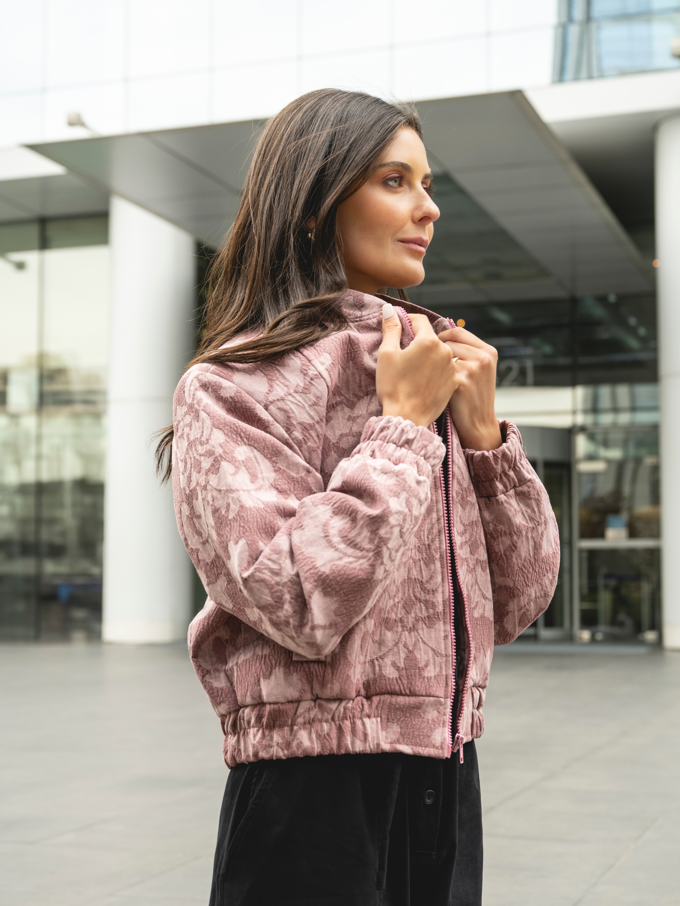 Chaqueta tipo bomber con cierre frontal de calce holgado y bolsillos laterales. Puño y pretina inferior elasticados. Fabricada en mezcla de algodón y poliéster con diseño en tonos rosados.