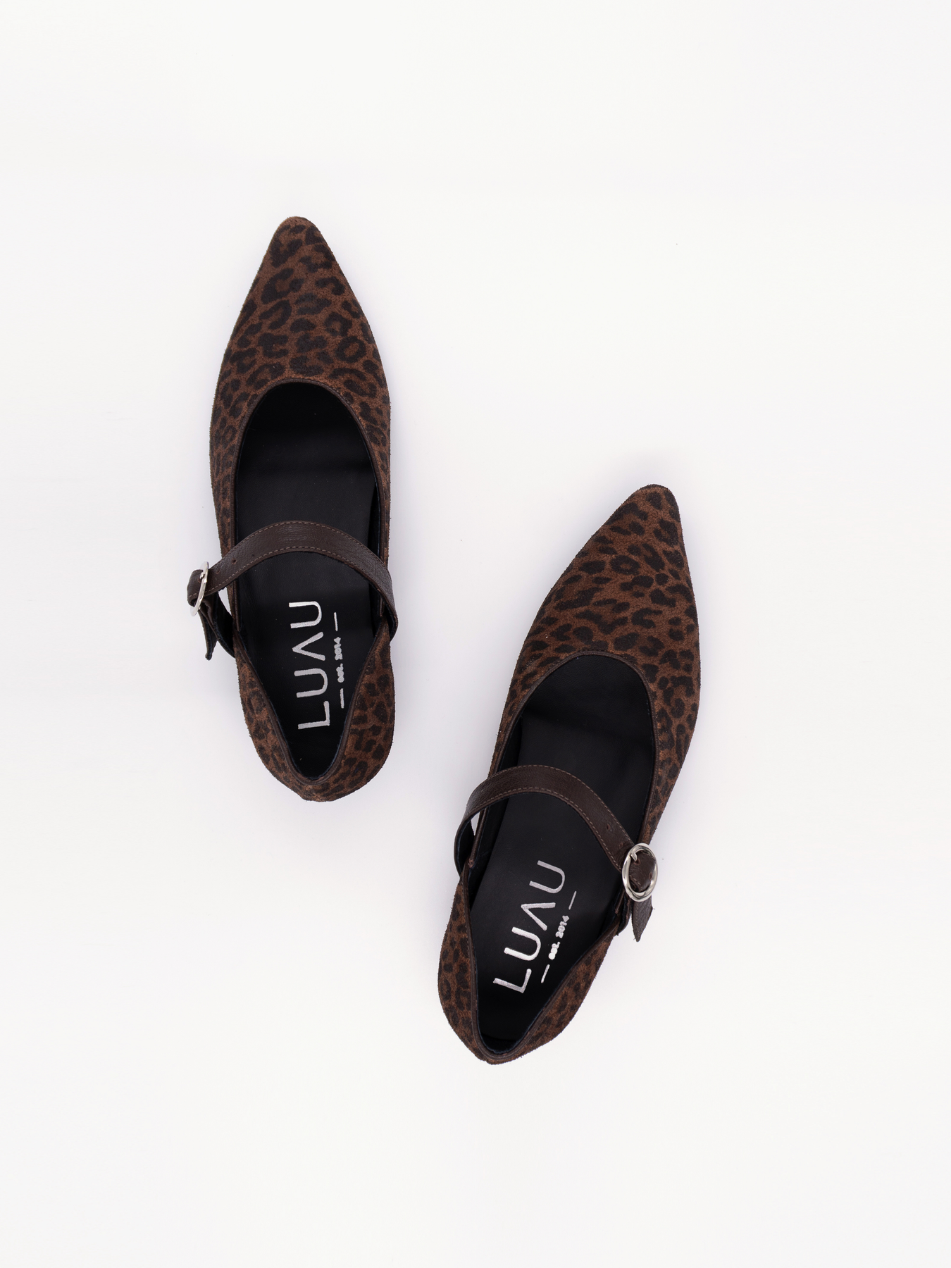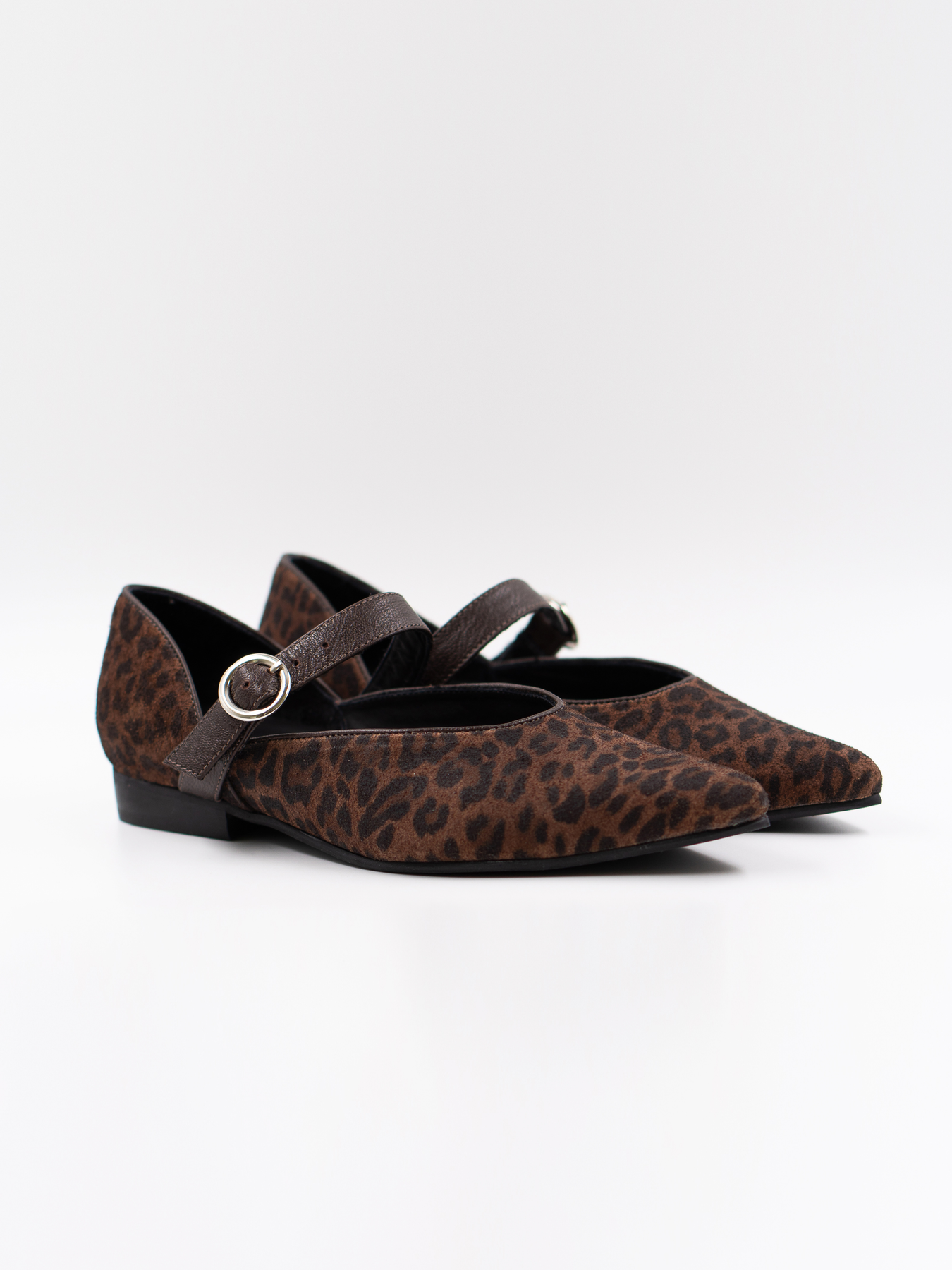 Ballerina en cuero reno con print cheeta, Con un detalle cruzado en cuero chocolate liso. Hebilla plateada.