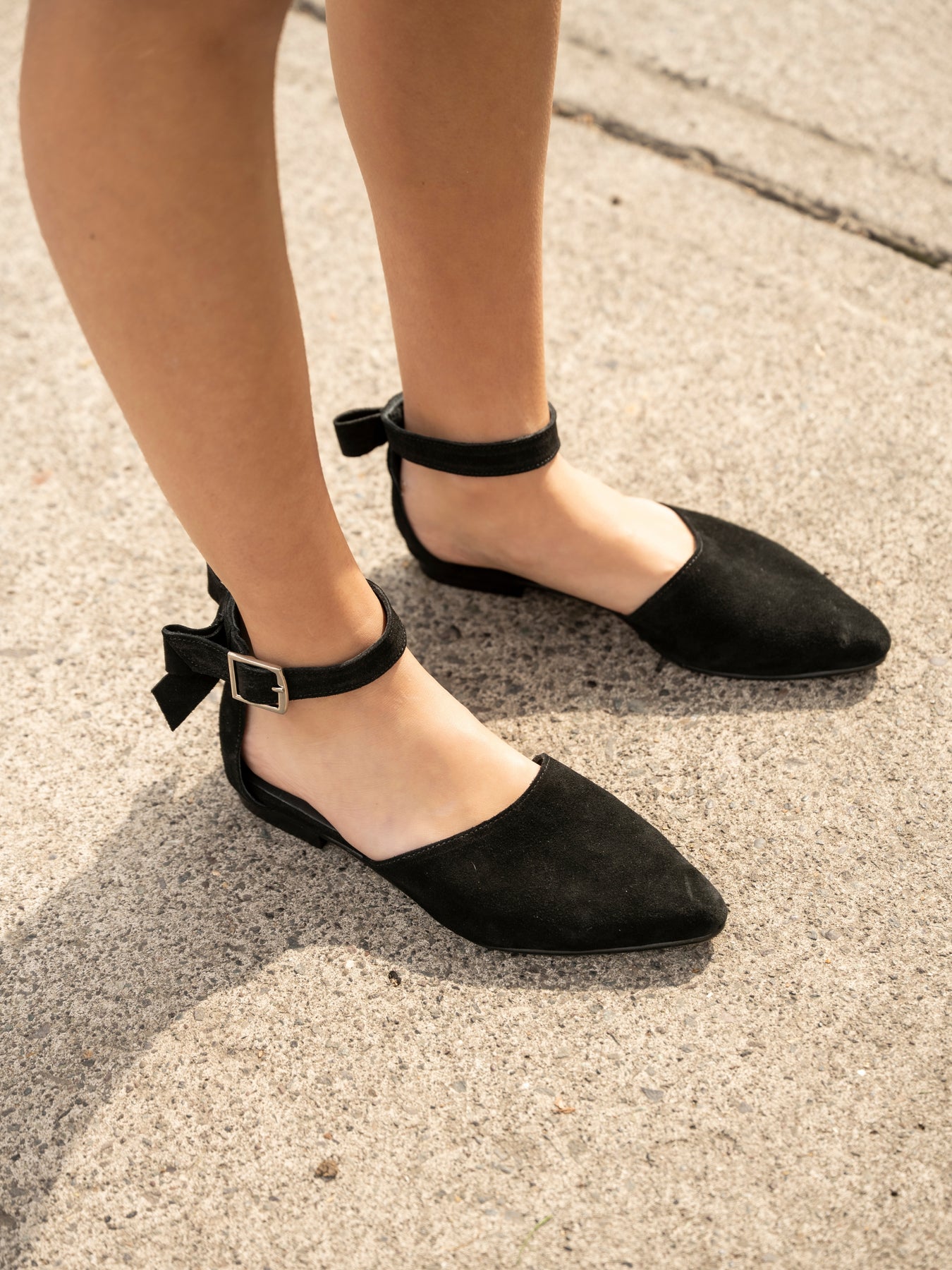 Zapato en cuero reno negro, de punta fina y diseño sofisticado. La cinta fija que rodea el tobillo aporta un detalle distintivo y elegante, convirtiéndolo en un calzado versátil para el día y la noche.