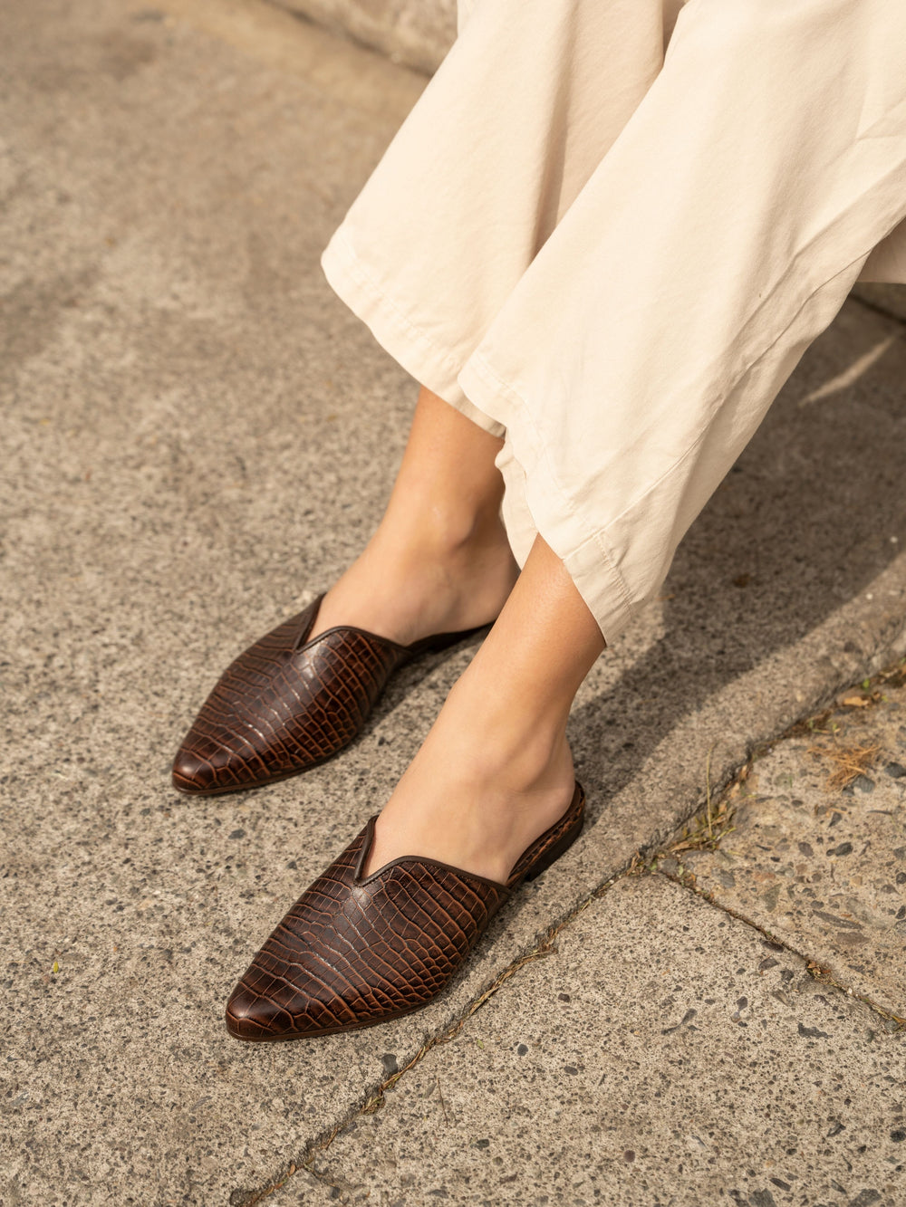 Babucha en cuero croco color moro, de punta estilizada y diseño minimalista. Elegante y versátil, es la opción ideal para un look sofisticado y cómodo durante todo el día.