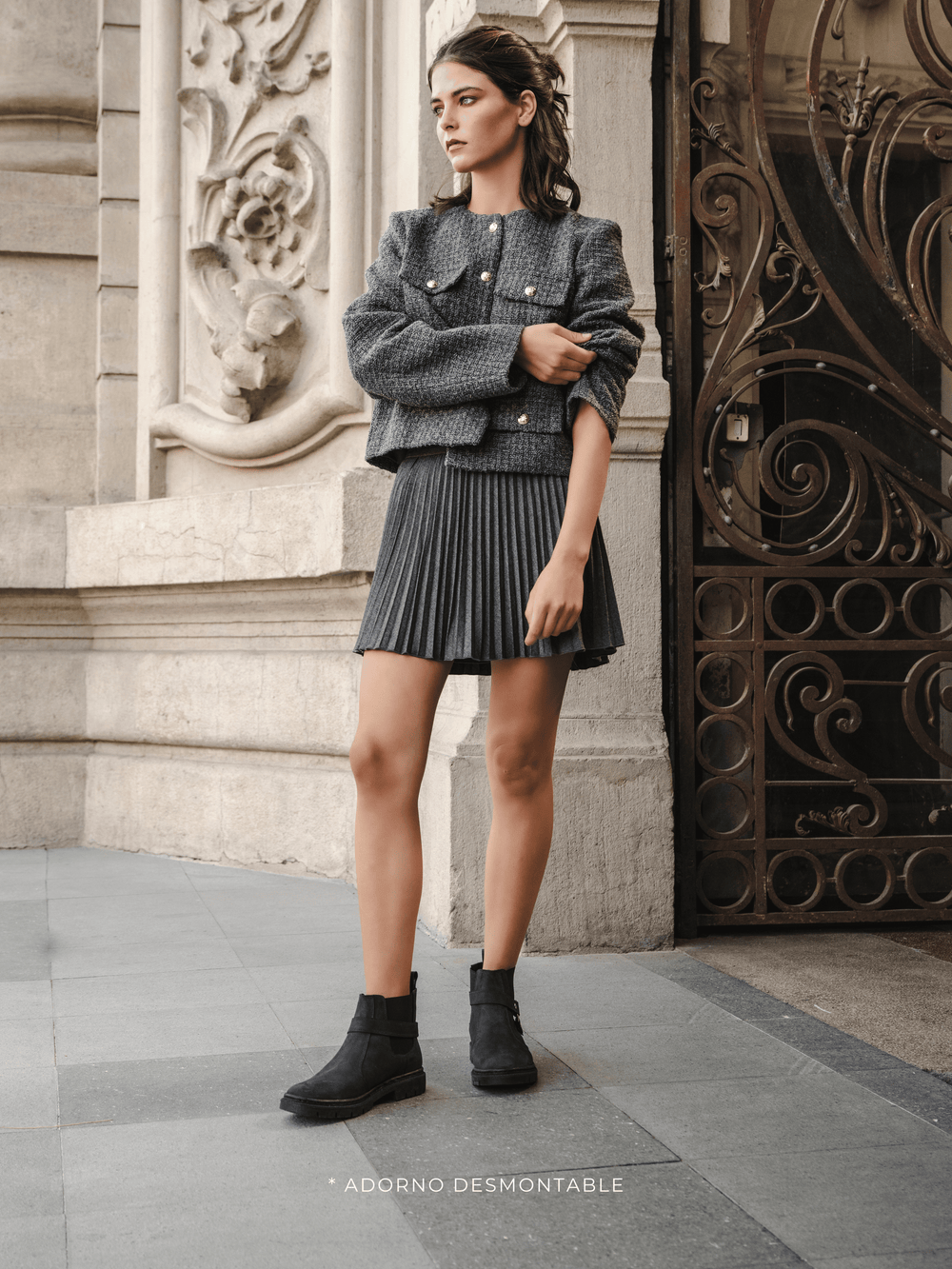 Botín en cuero liso engrasado negro, con tira desmontable y detalle metálico que permiten transformarlo en dos estilos distintos. Versátil, cómodo y resistente, un 2 en 1 ideal para acompañar tu día a día con personalidad.