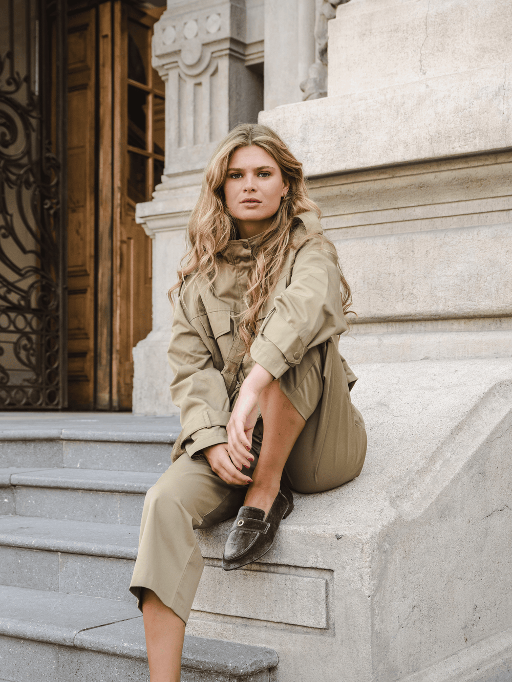 Mocasín en terciopelo verde, con acabado suave y detalle metálico frontal que aporta distinción. Sofisticado y cómodo, perfecto para dar un aire elegante a cualquier look.
