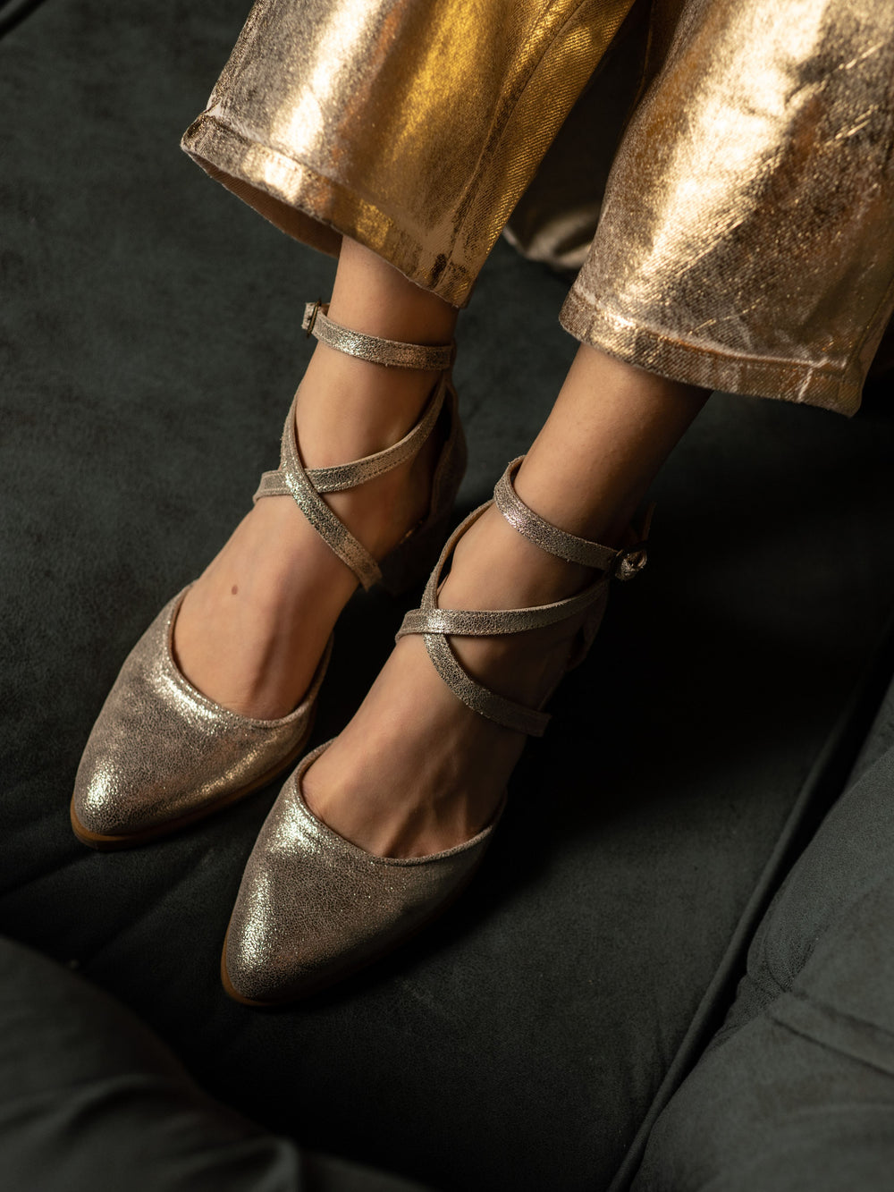 Zapato de fiesta en cuero con folia dorada, con punta redonda y delicadas tiras al tobillo que realzan el diseño. Su taco forrado de 5 cm aporta comodidad sin perder elegancia, ideal para acompañarte en ocasiones especiales.