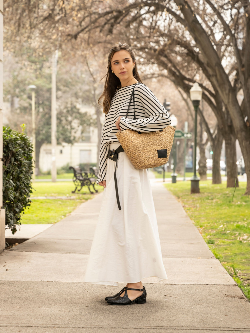 Zapato en cuero negro con textura escamada, de líneas elegantes y sofisticadas. Las tiras cruzadas realzan el empeine aportando firmeza y estilo, ideal para acompañar desde looks formales hasta casual chic.